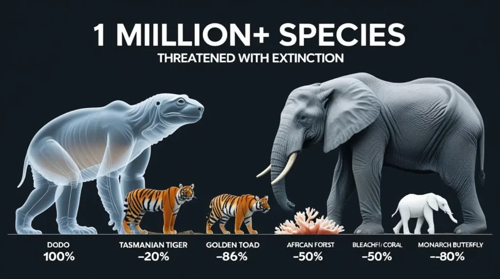 Current species extinction rates are 100 to 1,000 times higher than natural background rates, creating what scientists call the “sixth mass extinction.”