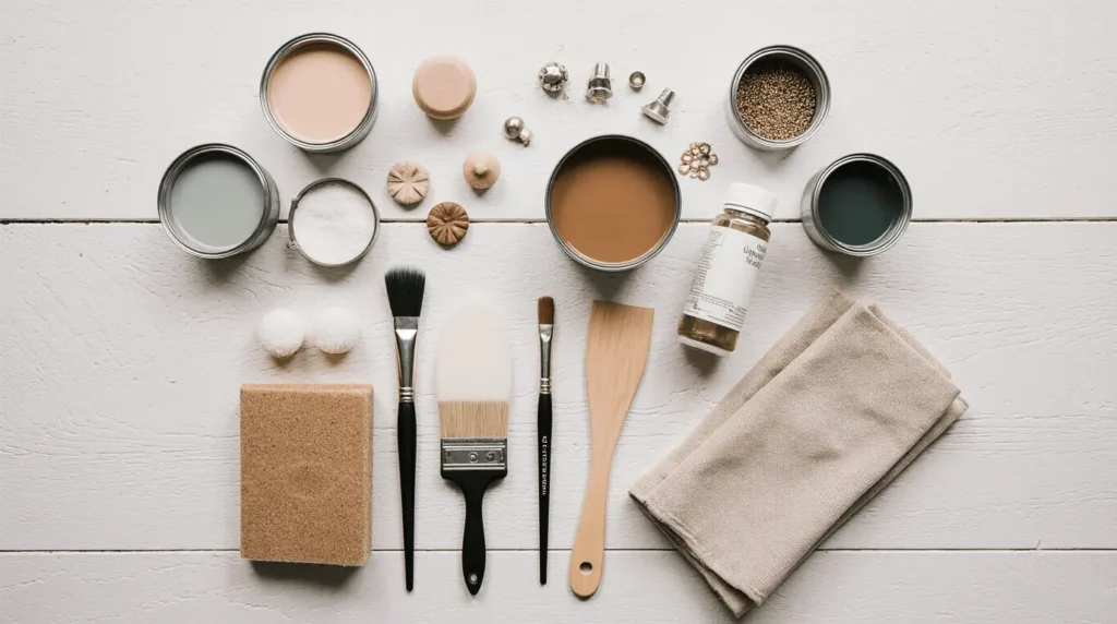 Cleaning Supplies: Sugar soap or TSP cleaner Repair Materials: Wood filler for scratches and holes Sandpaper: Various grits (80, 120, 180) Paint Supplies: Primer, quality brushes, and paint Protective Gear: Masks and gloves for safety